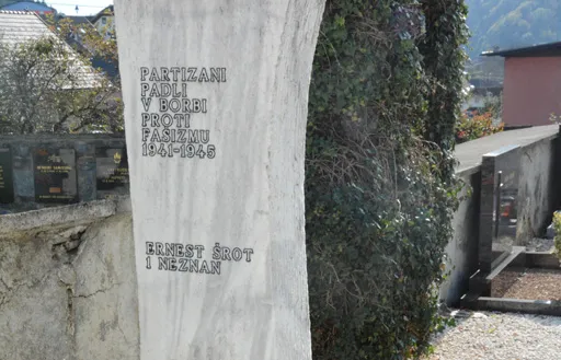 The northernmost partisan monument is in Svinec / Eberstein, a small town with an old manor house. Celovec / Klagenfurt is 35 kilometres away. In the sensibly laid out cemetery, a real park, a tall stone square is prominently placed with an inscription indicating that here is the grave of two fallen partisans of the Northern Battalion of the Carinthian Detachment. The first, Ernest Šrot, is known to have been born in 1929 in Leše near Ravne na Koroškem, while the name of the second remains unknown. Both of them arrived at the end of March 1945, completely exhausted, from the Svinška planina / Saualpe mountain near Svinec / Eberstein. In the high snow, they were captured by the Nazi gendarmerie and taken to the station in Svinec / Eberstein. After interrogation, they were led back to the place where they had been captured and shot.